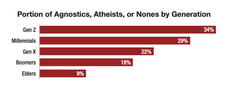 Still, the study appears to show that non-religious identification has grown with each generation. Only 9 percent of elders, 18% percent of boomers, 22 percent of Gen X, and 29 percent of millennials identify as “Agnostic, Atheist or None.”